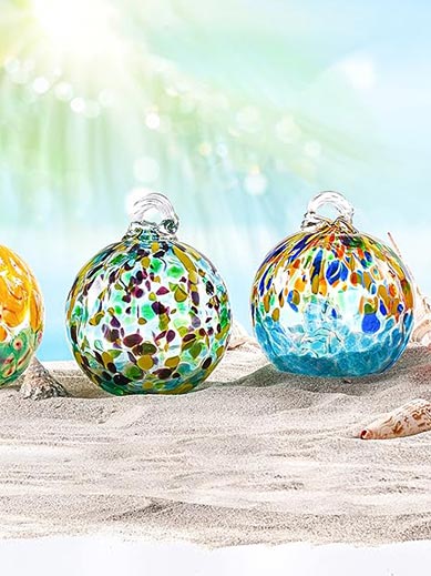 Iridescent hand-blown glass hanging orbs—each has unique texture, like a mini work of art. Gift-boxed for gifting, they’re perfect for housewarmings or anniversary surprises.