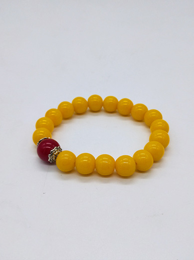 This bracelet is crafted from glass and strung with bright yellow beads. Its vibrant, lustrous color is visually arresting. Paired with a rich red bead, the bold yet harmonious contrast of red and yellow instantly elevates the bracelet's overall style and uniqueness. Delicate metal embellishments flank the red bead, adding a touch of vintage charm and exquisite detail.